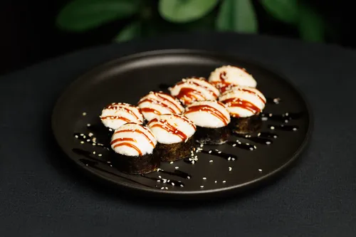 Рис, нори, творожный сыр, огурец, креветка, сырный соус, унаги, кунжут