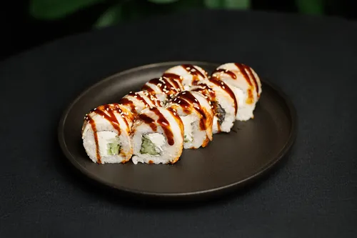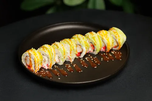 Рис, творожный сыр, икра масаго, креветка панко, авокадо, манго чили соус, нори, кунжут