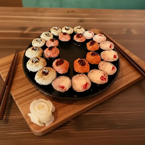 Рис, нори, творожный сыр, огурец, лосось, тростниковый сахар