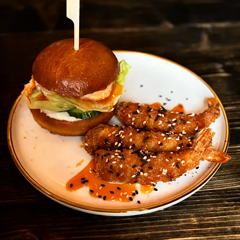 Мини-бургер с креветками гриль и соусом манго. Три креветки-панко с соусом манго